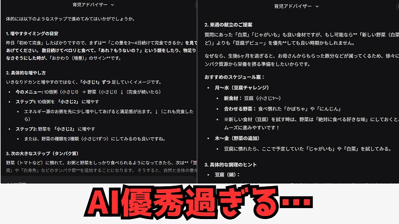 このときのスケジュール感や順番は、自分の冷蔵庫を見て適当に決めつつ、AIに相談しつつ…。